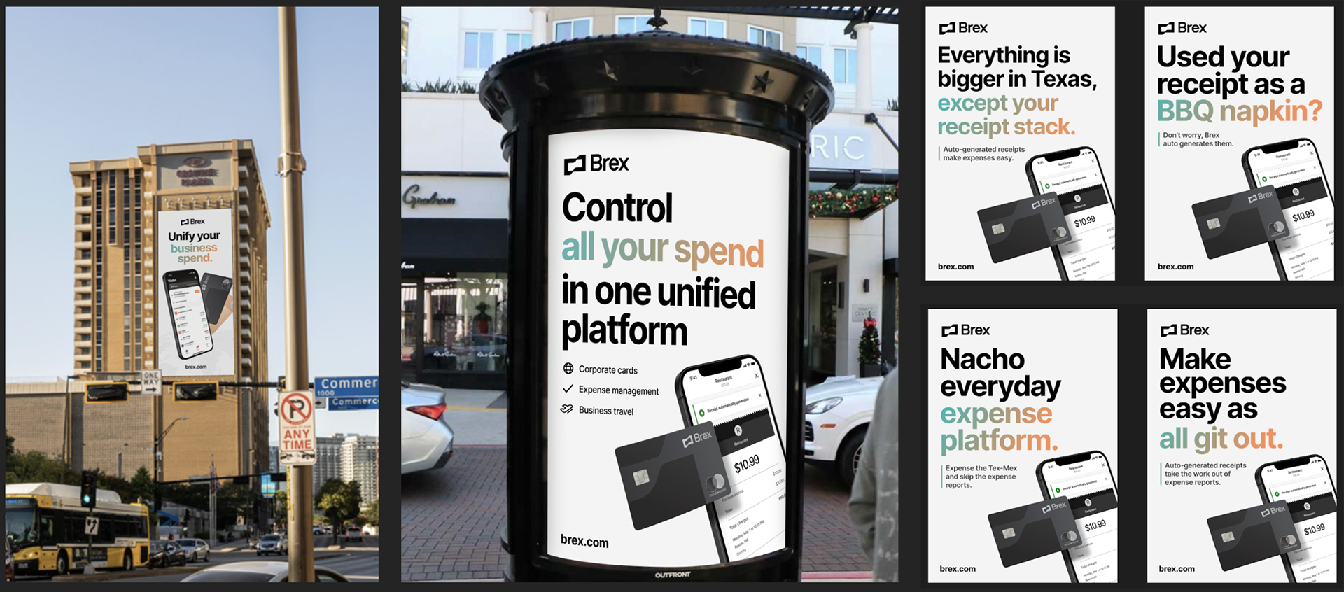 Brex, a financial services company for startups, does tons of out of home placements. I contextualized a few sets of these for specific locations, like Las Vegas, Dallas, Seattle, and Boston. The Boston units were noticed by the Boston Celtics, who loved them so much they made Brex their official corporate card partner. Score!.